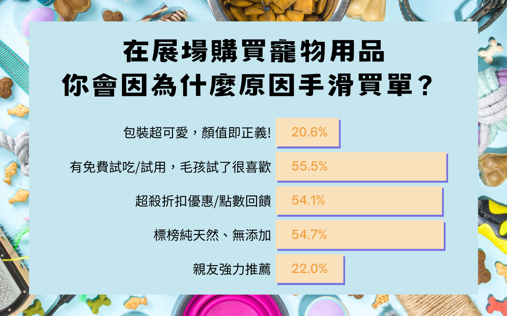 根據本次調查發現,促使毛爸毛媽們理智線斷裂、決定掏錢買單的冠亞軍原因,其實非常有愛!高達 55.5% 的飼主表示,只要「有免費試吃/試用,毛孩試了很喜歡」,就會毫不猶豫地買單 ;緊追在後的是佔了 54.7% 的「標榜純天然、無添加」,相當重視食安!這證明了現代飼主早就不是單純的「外貌協會」(包裝可愛佔 20.6% ),主子吃得開心又健康才是王道!當然,精打細算的基因還是深植人心,有 54.1% 的人會因為「超殺折扣優惠/點數回饋」而心動 。