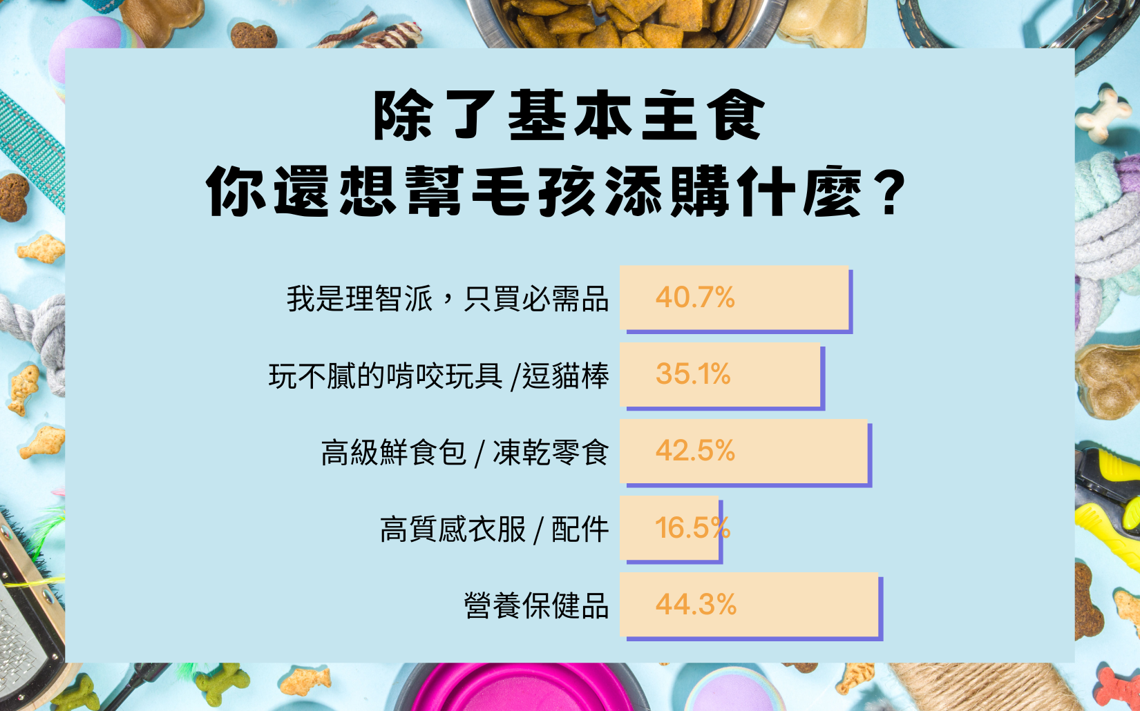 有趣的是,當問到除了基本主食還會幫毛孩添購什麼時,大家最愛買的竟然不是玩具,而是營養保健品(44.3%) !比例甚至超越了高級鮮食與凍乾零食(42.5%) 。看來大家為了讓毛孩長伴左右,在養生保健上的投資可是完全沒在手軟的。而這當中也有 40.7% 的毛爸毛媽是只買必需品的理智派,至於這份理智到了展場還能不能維持住,就不好說啦!