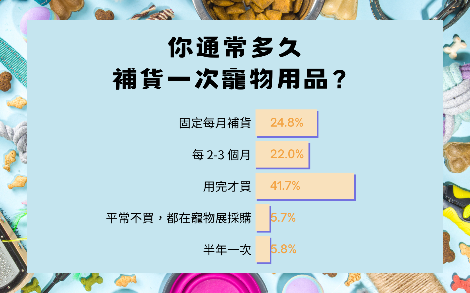 在補貨頻率上,可以發現呈現出多元的生活型態!有高達 41.7% 的毛爸毛媽屬於「用完才買」的隨性機動派 ;另外也有 24.8% 習慣「固定每月補貨」以及 22% 選擇「每2-3個月」採買一次的計畫型買家 。